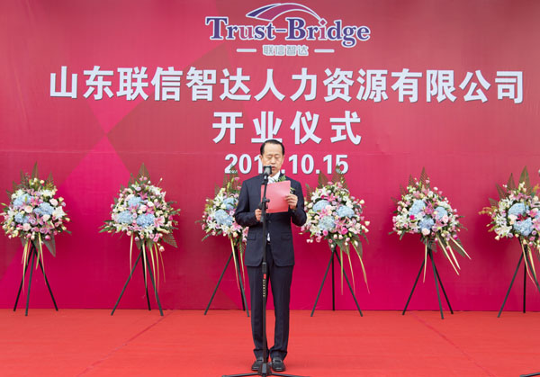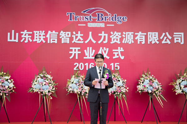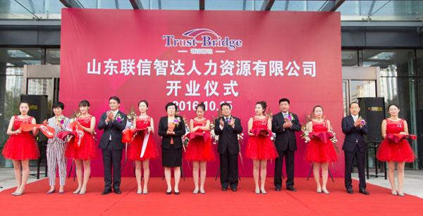 2016年10月15日上午8:30,由威海聯橋集團與日本株式會社Trust-Tech共同出資成立的山東省首家中外合資人力資源公司—山東聯信智達人力資源有限公司開業儀式隆重舉行。人社部勞動爭議研究室主任李天國、威海市人社局局長王子明、威海市商務局副局長劉秀景,高區黨工委副書記、管委常務副主任喬軍,聯橋集團董事長慕镕鍵、日本株式會社Trust-Tech社長西田穰等領導以及聯橋集團員工、事業合作伙伴、媒體記者等共計200余人參加了開業儀式。山東聯信智達人力資源有限公司總經理梁瀟尹主持開業儀式。