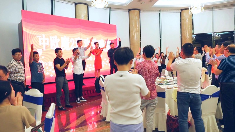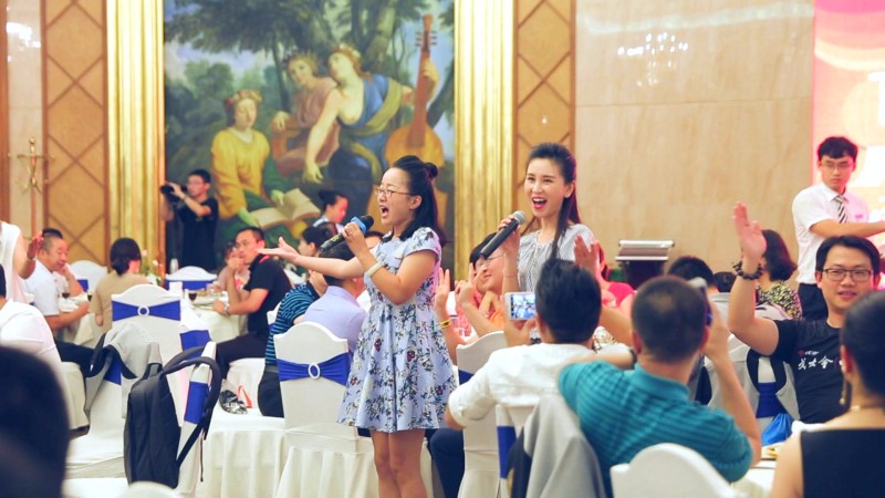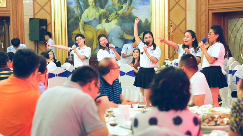 如果說下午的座談讓大家受益匪淺,那么晚上的接待晚宴,則讓所有學員感到興奮不已和深深震撼。在慕衛(wèi)波董事幽默風趣的祝酒詞后,在杯盞交換暖意融融的席間,隨著悠揚的音樂響起,深情的《老同學》歌聲從身邊飄來,拉開了由聯(lián)橋藍色暢想合唱團快閃表演的帷幕。《童年》、《哎呦媽媽》、《朋友》等經(jīng)典歌曲,帶給現(xiàn)場學員一次又一次的驚喜,《我的太陽》則將整場晚宴推向了高潮。