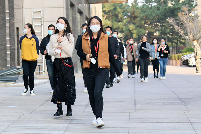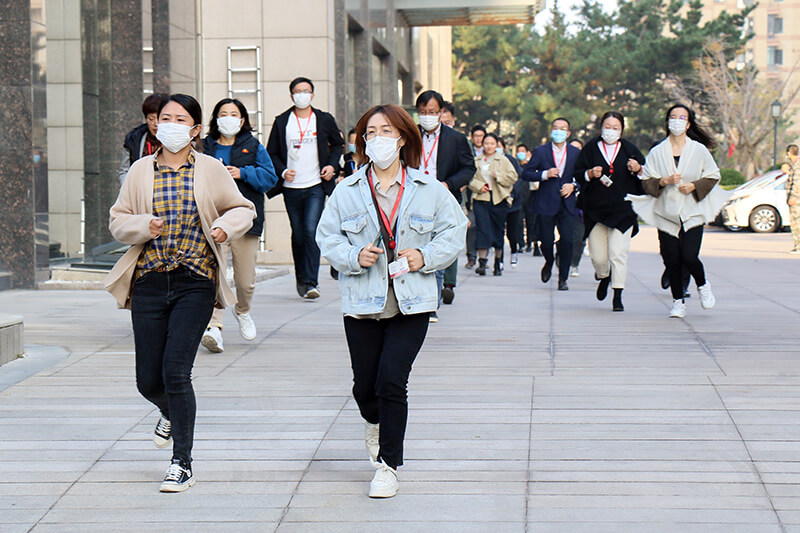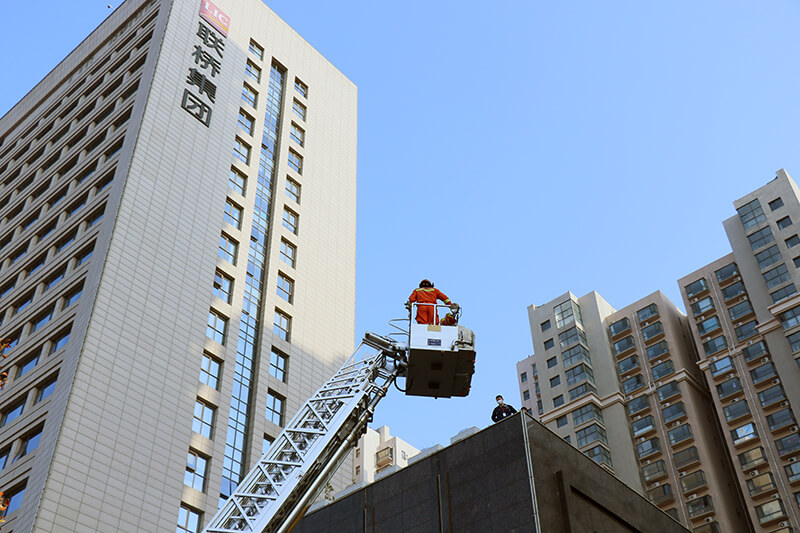 當天15:00,聯橋集團運營總監、消防疏散演練總指揮劉旭波一聲令下,演練正式拉開帷幕。警報聲響起,全體員工在各樓層安全員引導下迅速有序疏散到安全地帶,并進行點名,與此同時消防車呼嘯而來,利用云梯消防車營救避難平臺被困人員,隨后,消防員成功撲滅“火災”。