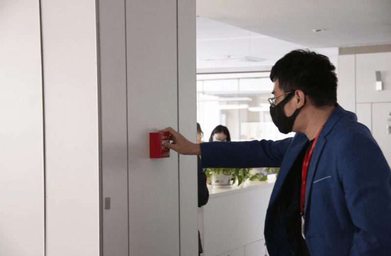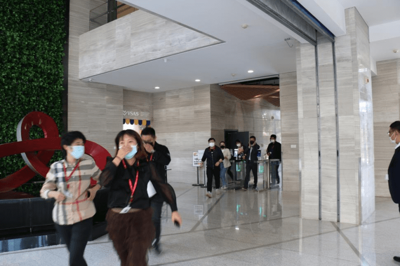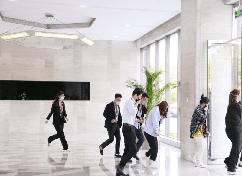 與此同時,應急廣播在接到“火情”第一時間響起,相關樓層員工聽到廣播在安全員的指揮引導下,快速有序地集體撤離至安全集合點,由相關負責人統計清點人員。