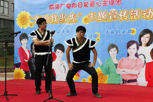 2015年10月16日,威海廣電攜手聯(lián)橋集團(tuán)在集團(tuán)海天一品社區(qū)噴泉廣場(chǎng)舉行“文明我當(dāng)先”主題宣傳活動(dòng)。威海電視臺(tái)愛心主播白雪、張帆、齊賽、劉偉豪等親臨現(xiàn)場(chǎng),通過(guò)節(jié)目表演、知識(shí)講解,做游戲等形式,與大家互動(dòng)交流,在輕松愉快中傳播“愛文明家園做文明市民”的理念。